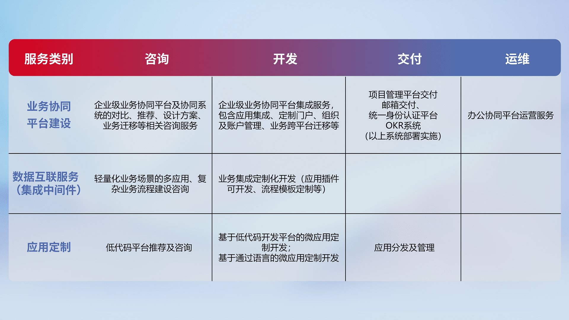 针对钉钉、、、企微、、、、IDaas等平台级产品提供产品的规划、、、方案、、、交付、、定制化开发等服务,,,,实现如统一协同办公、、智能客户服务、、、混合会议管理、、、智能数据查询、、、等业务场景,,实现数字化转型。。。。