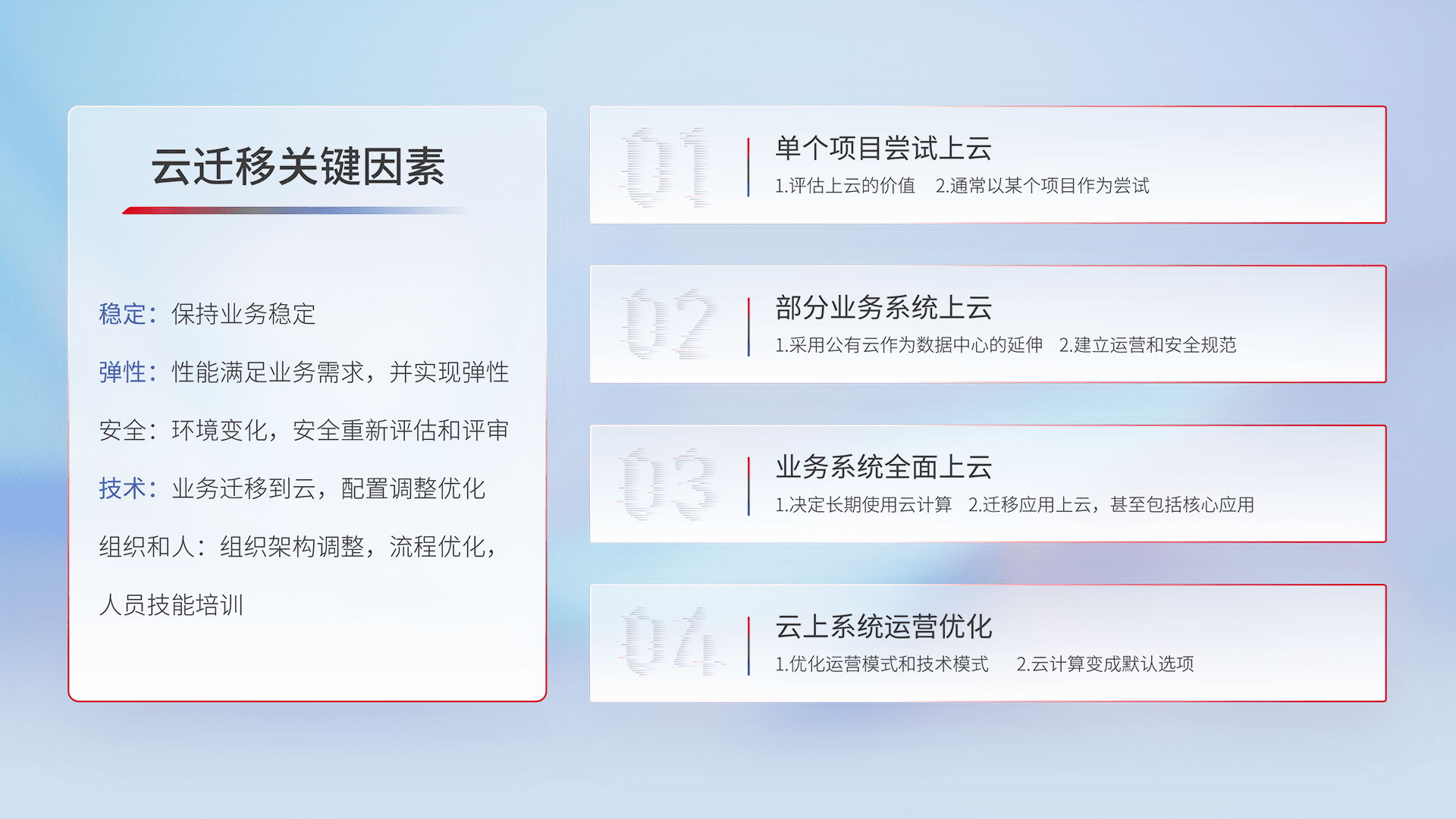 结合实际业务,,,从规划设计、、云平台选型、、云原生改造、、、、数据迁移、、、、集成交付,,,,迁移全过程为客户识别最佳上云路径,,,,做好风险识别管理,,,,设计网络架构、、、身份权限、、、、安全审计合规、、、操作审计、、日志审计、、、、监控告警策略、、、多站点容灾设计等,,,,对云上基础设施进行整体规划,,,提升IT治理水平,,,,以满足弹性、、、、高可用、、、高性能的需求。。
