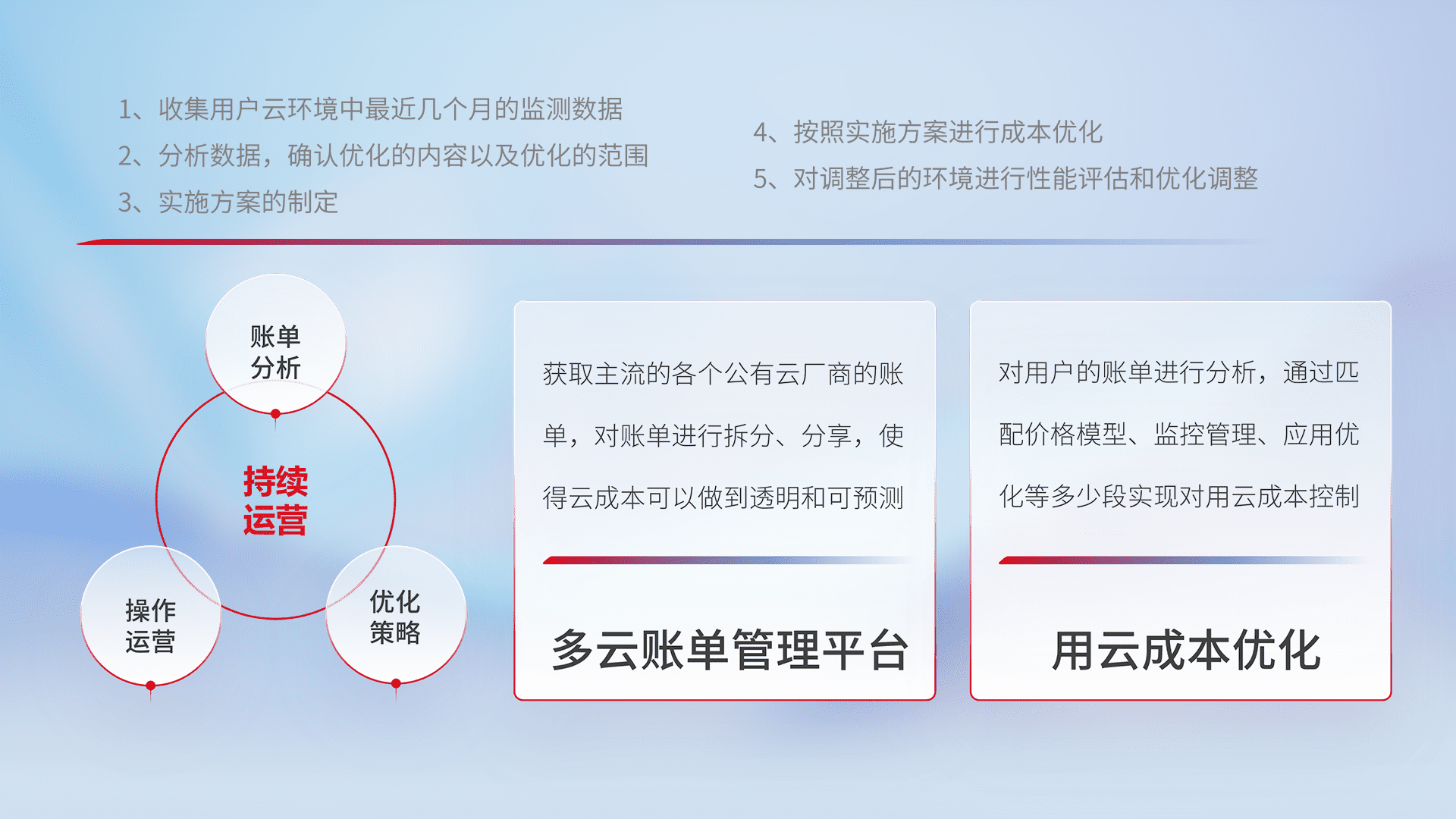 通过多云纳管,,以统一的资源数据模型把客户的云资源进行抽象和封装,,,进而实现对多云资源的统一操作,,,保障云资源管理的可靠性、、稳定性与可用性。。。量身定制化运维内容,,配置、、开发运维、、补丁管理、、、、备份、、、、监控、、、、认证和访问管理、、审计和日常巡检等,,,保障在用云过程中的可靠度,,稳定度以及高可用率。。。